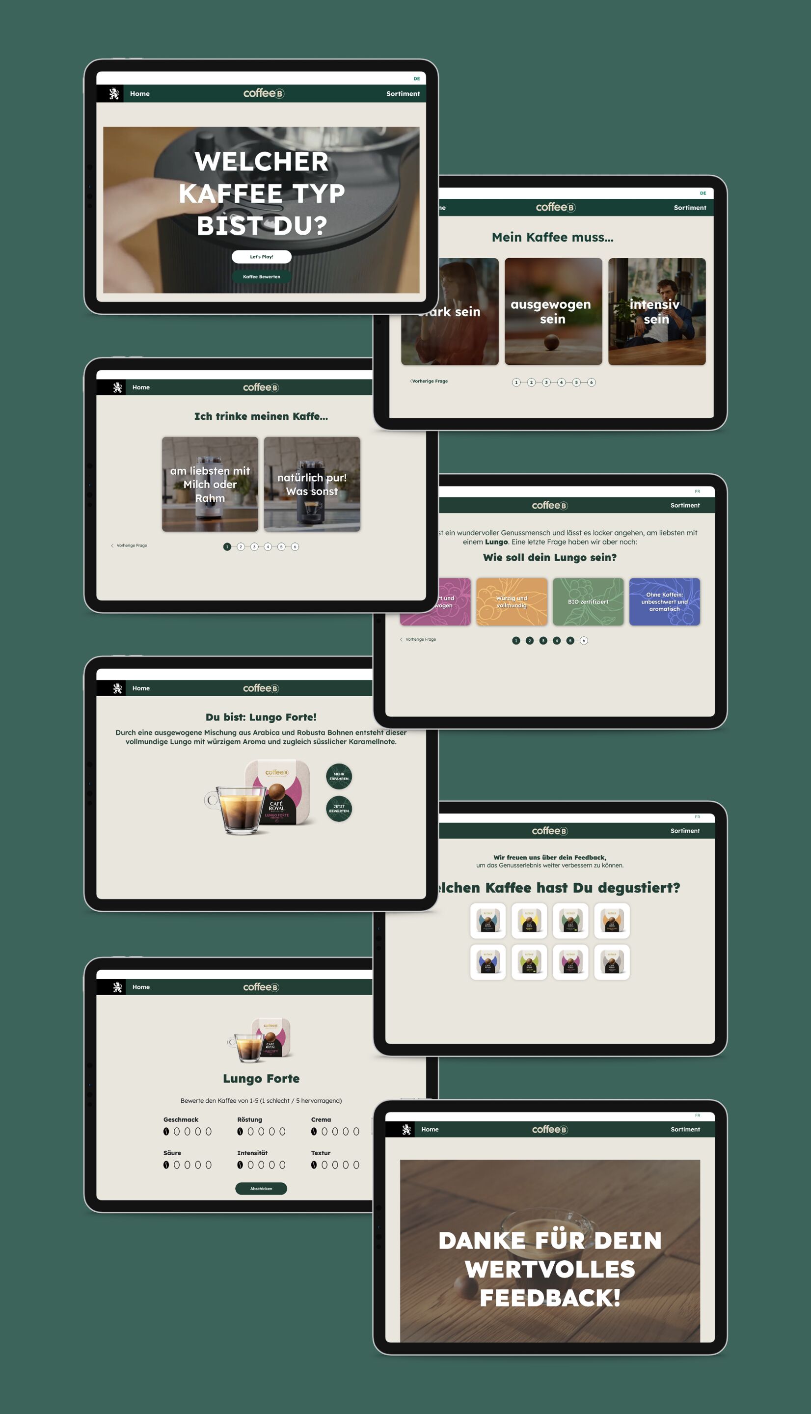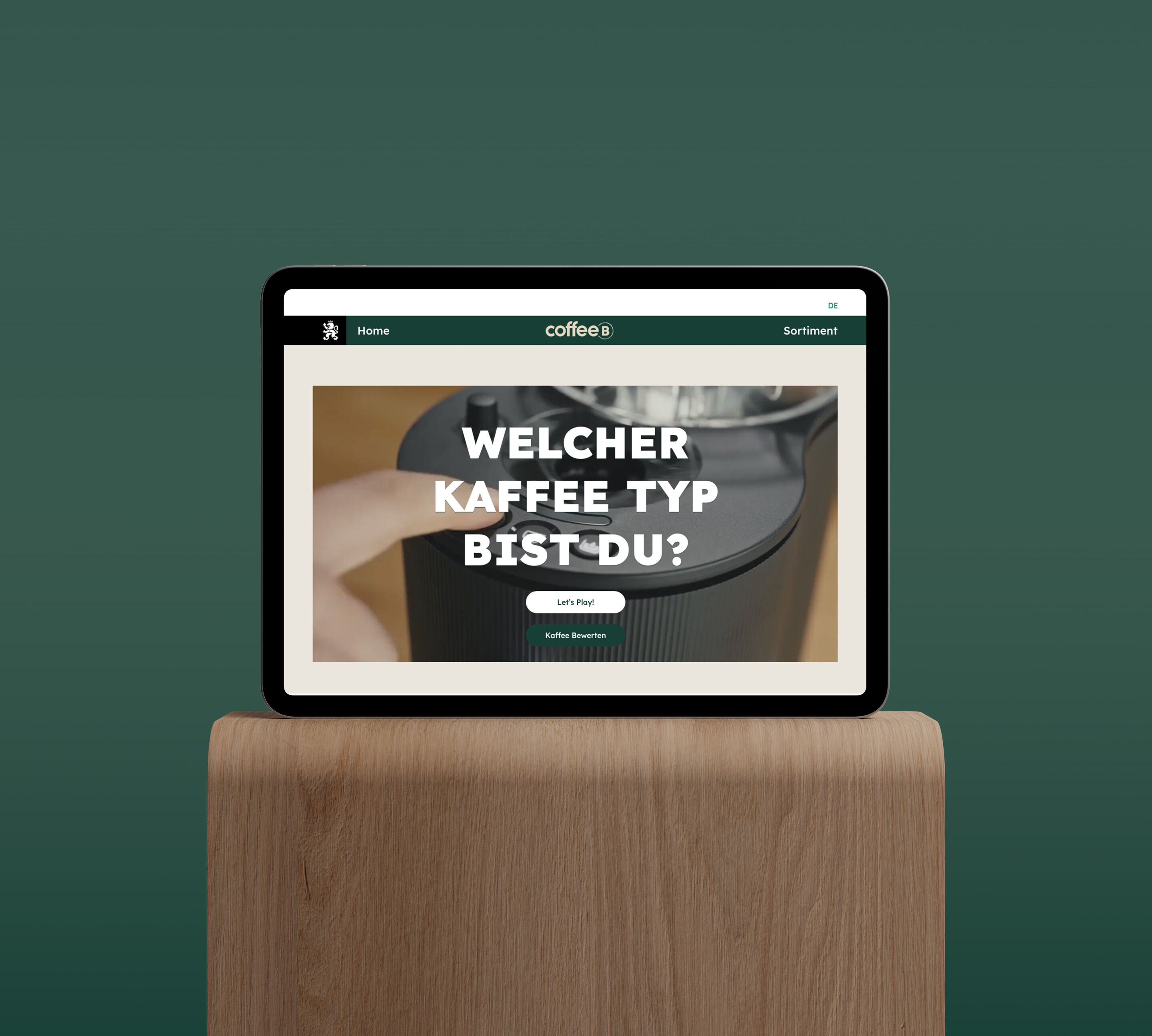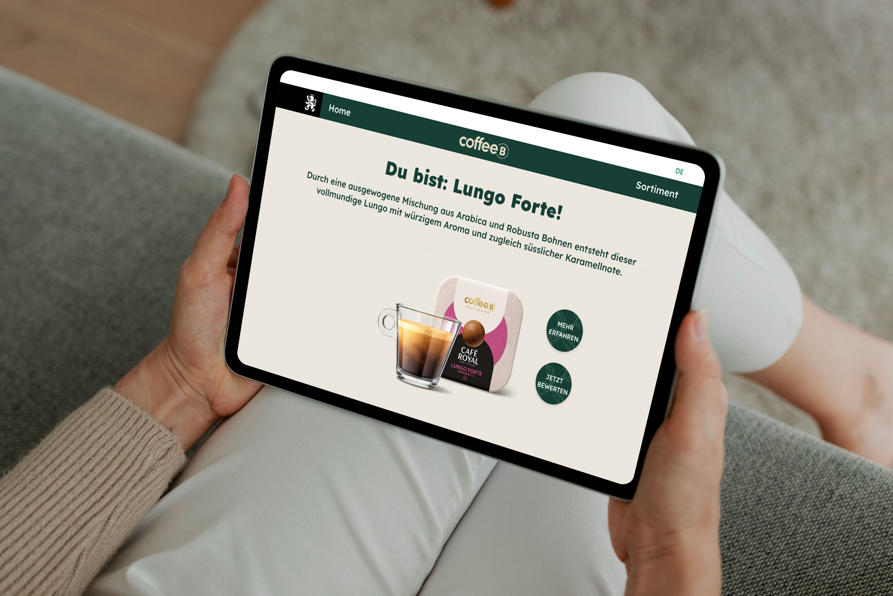 To support sampling and conversion at the point of experience, we developed a web app that is now used by Promotion-Tools promoters at tastings across Switzerland and Germany. The tool guides potential customers through the CoffeeB universe, helps them identify their coffee type and connects the product story directly to the tasting moment.